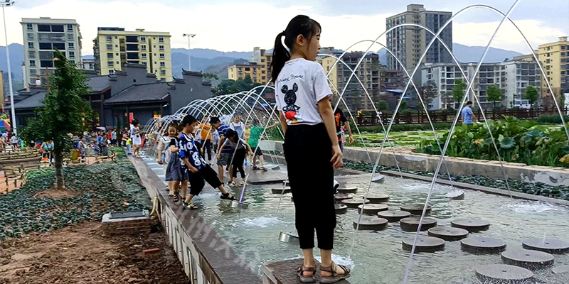 項目位于重慶的一個休閑度假農(nóng)莊,在水系景觀兩側安裝了互動的跳泉,趣味性強,飲料效果好,深受小朋友的喜愛。